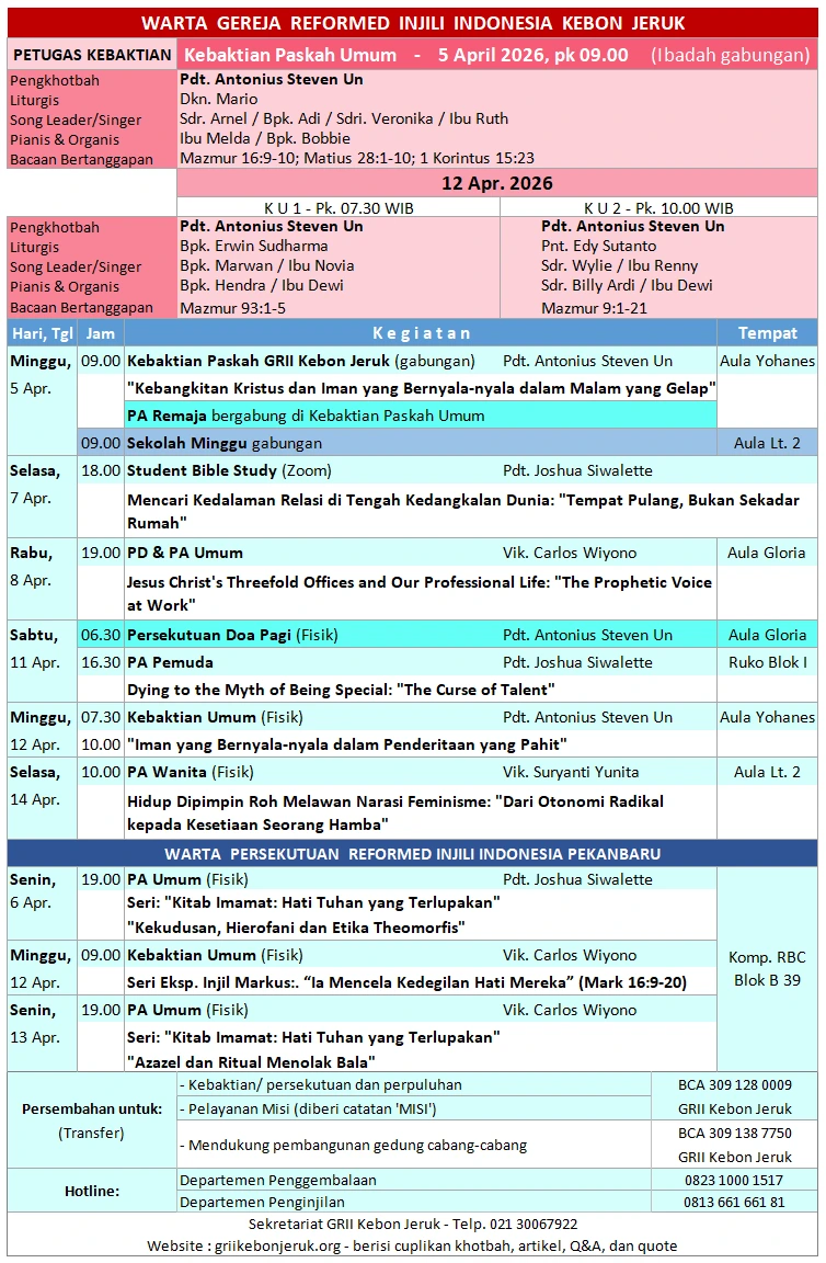 Puji syukur kepada Allah Tritunggal, sehingga Kebaktian Paskah Sekolah Minggu GRII Kebon Jeruk, pada tanggal 13 …